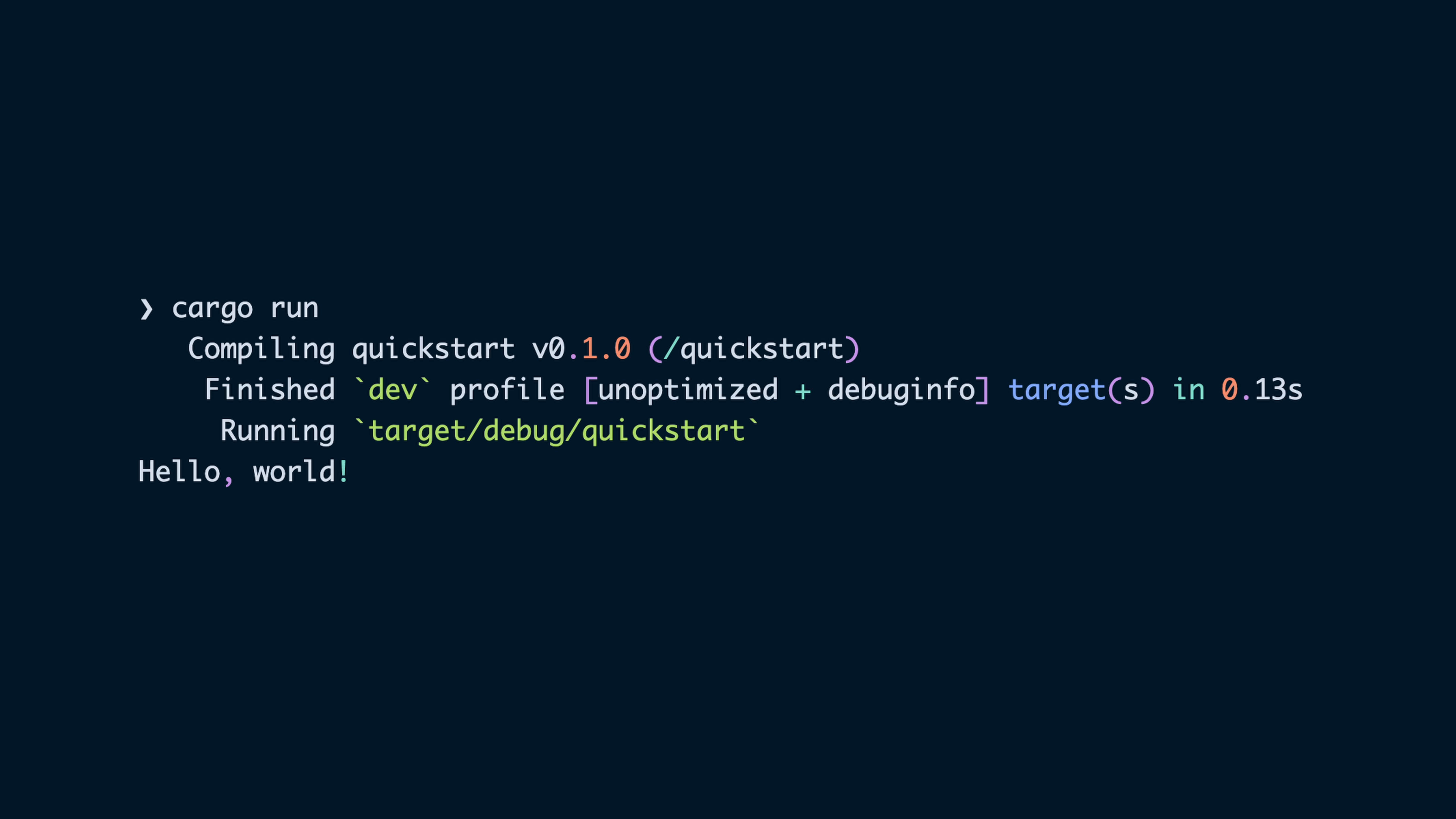 cargo run combines cargo check with cargo build, then runs the built binary, which means when we cargo run we also get the built binary in our target directory. The binary for our quickstart program gets built at either target/debug/quickstart or target/release/quickstart, depending on which profile it was built with.