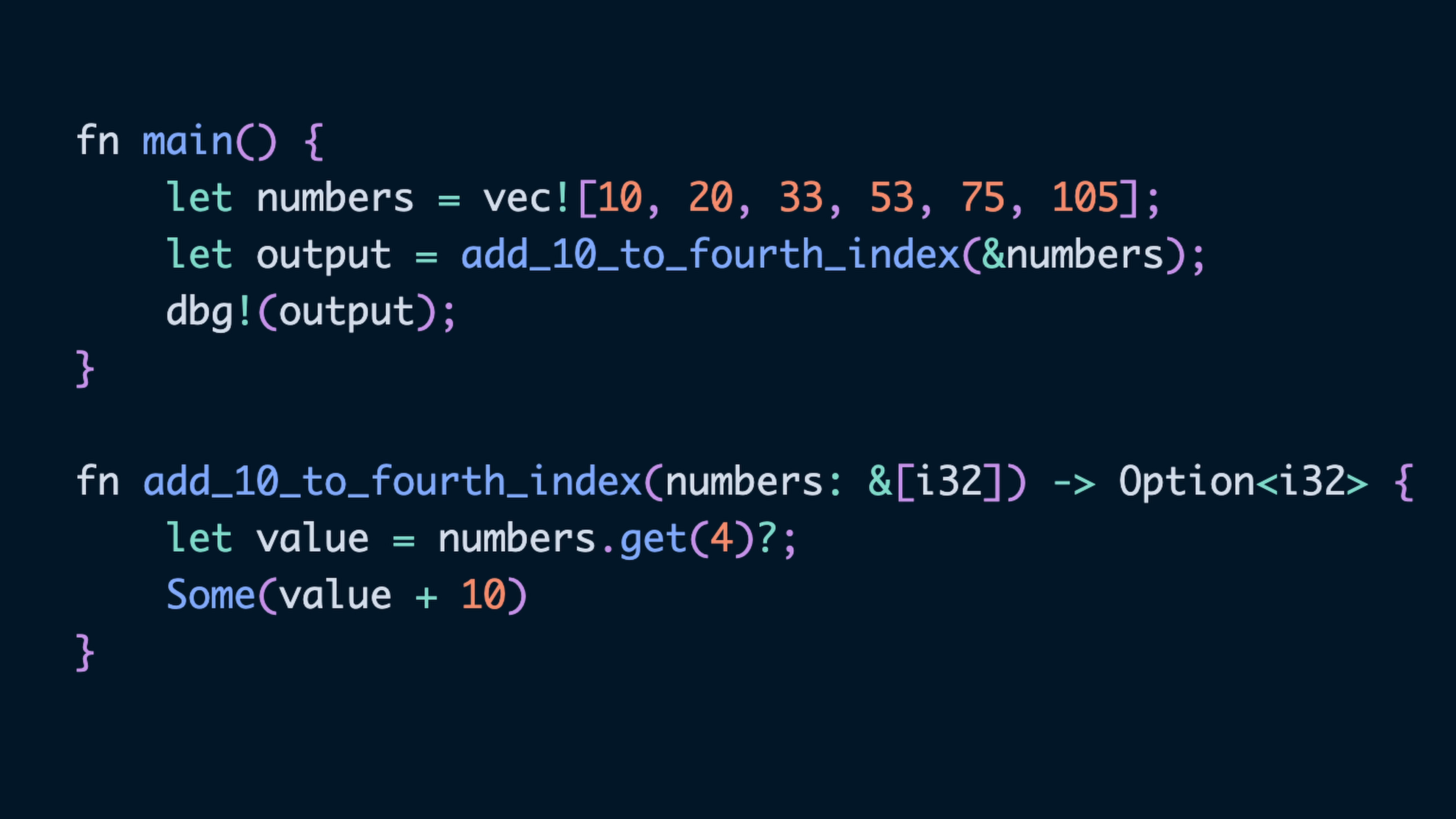 When writing a function, the return type can be an Option or Result. If the types that we’re using match, such as in the case of numbers.get(4) below, then we can use the ? operator to unwrap the value if its Some and return None otherwise. This function works on slices of length 5 or more, and returns None otherwise.