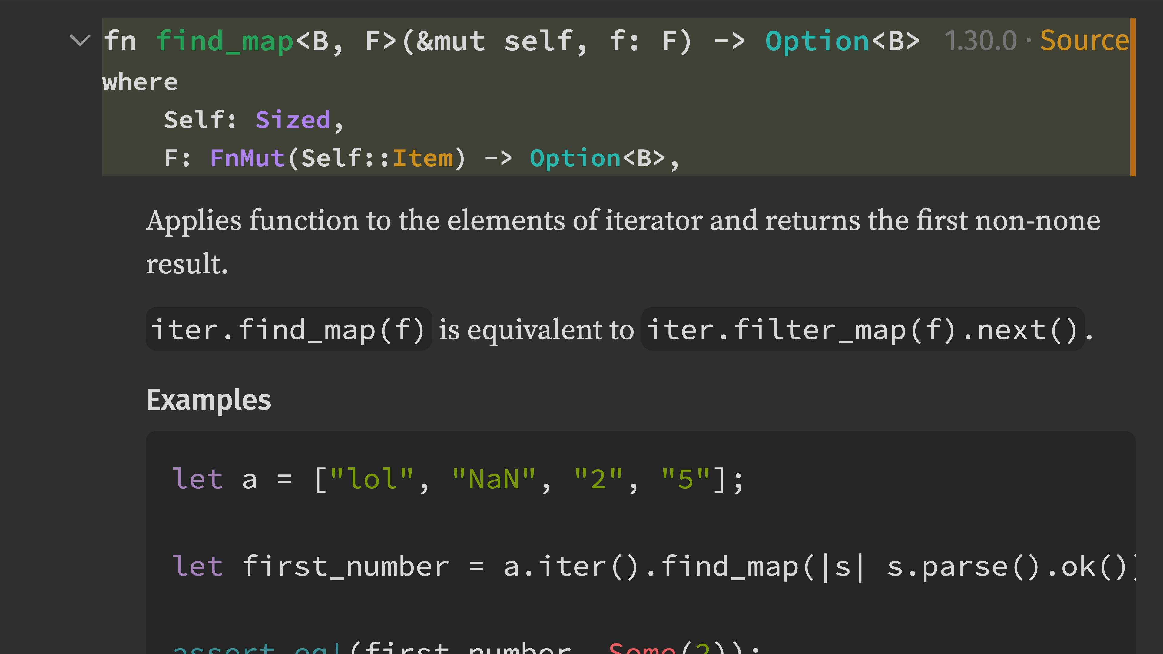 Iterators can also return a single value, such as when using sum to sum all the items, all to check that all items pass a test, or a function like find_map which will find an item that passes a test and transform it into a different type. This can be very useful when dealing with operations that can fail, like parse. Here’s an iterator that finds the first parsable number in a Vec<&str>.