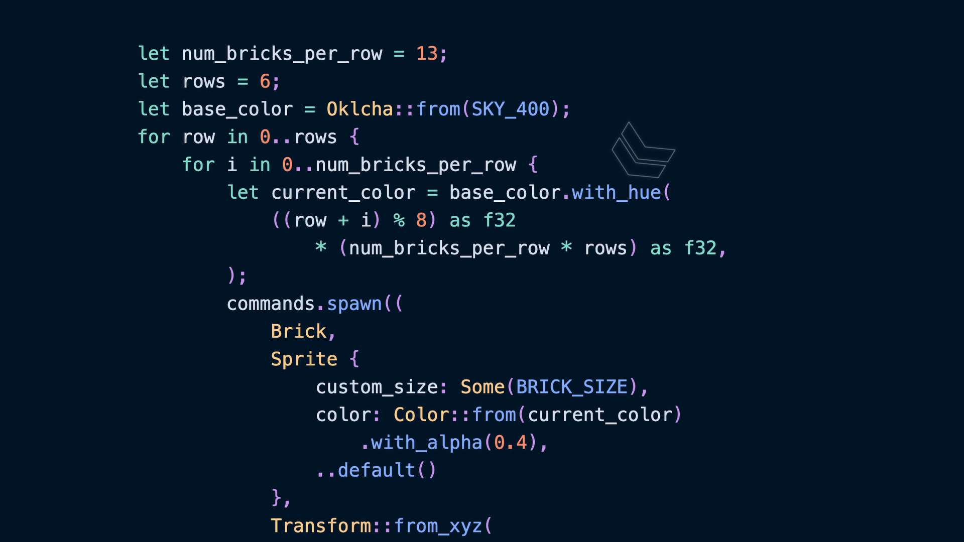 Spawning a Brick grid will be two loops: one loop for the row and one for the column. Here we define the number of bricks in a row to be 13 and the number of rows to be 6. We also define a base_color using an Oklcha color pulled from the tailwind palette. This is a perceptually uniform color space, which tldr; means that when we change the hue the color stays the same lightness as perceived by humans. The specific tailwind color we use is not terribly important, but it does define some preset values for lightness and chroma.