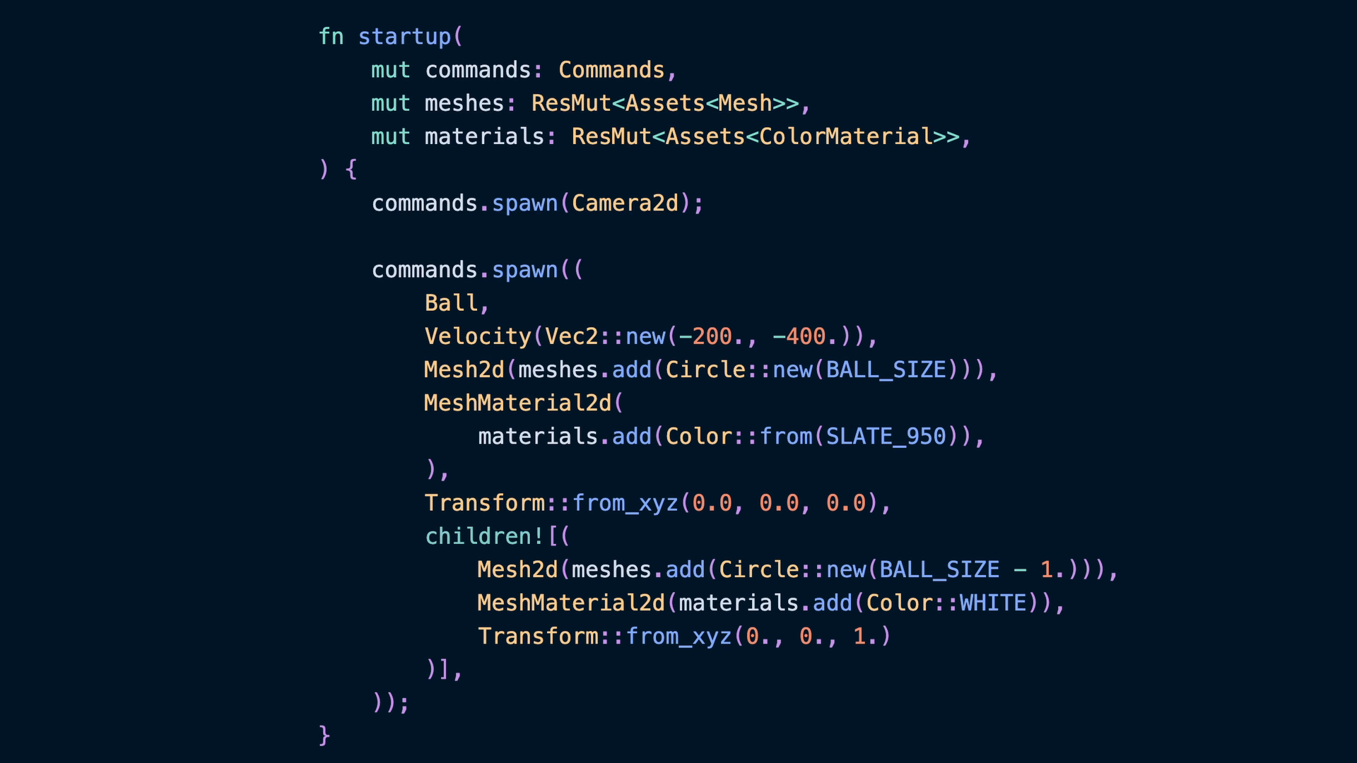 In the same startup system we want to spawn a ball and give it a velocity we can adjust during gameplay as the ball hits walls, bricks, and the paddle.